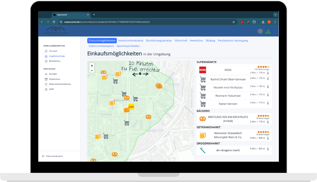 Unser Tool generiert nach einfacher Angabe der Adresse eine vollständige Übersicht von Einkaufsmöglichkeiten, zu medizinischer Versorgung und Bevölkerungsstruktur- als HTML, PDF und für Ihre Website.